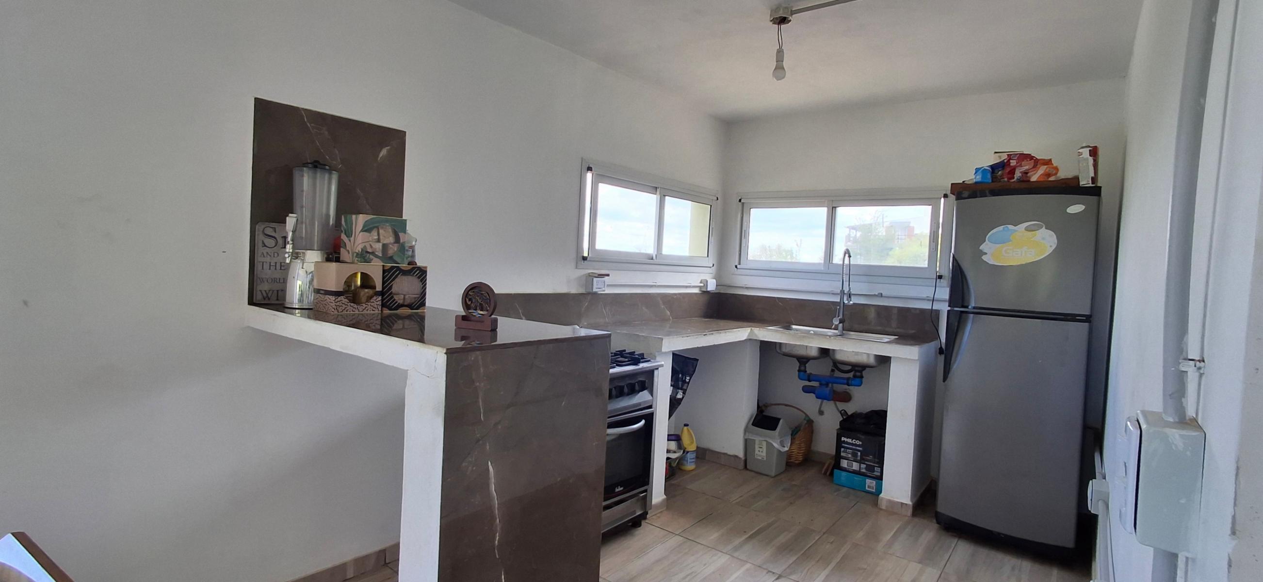 Cocina integrada a un living-comedor luminoso, con grandes ventanales y salida al exterior